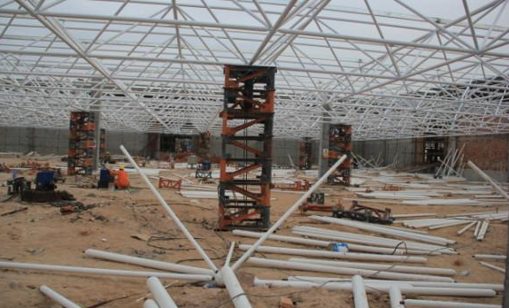5)总体晋职法:此步履多使用在周边支护以及有多点支护的网架结构,可采取平板升降机、液压千斤顶等小型机具作业丰城施工;